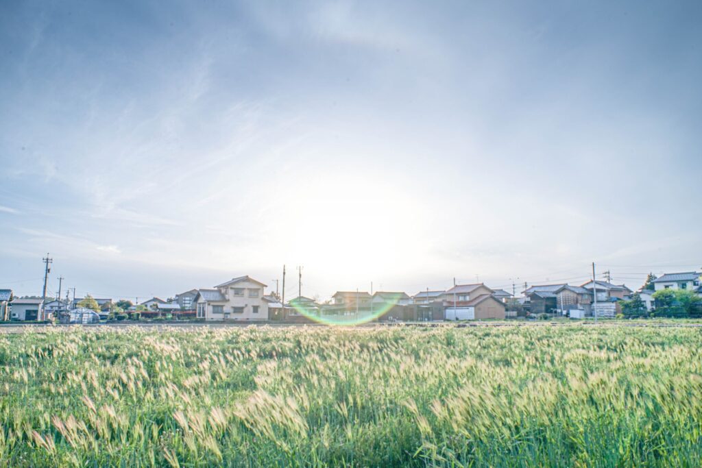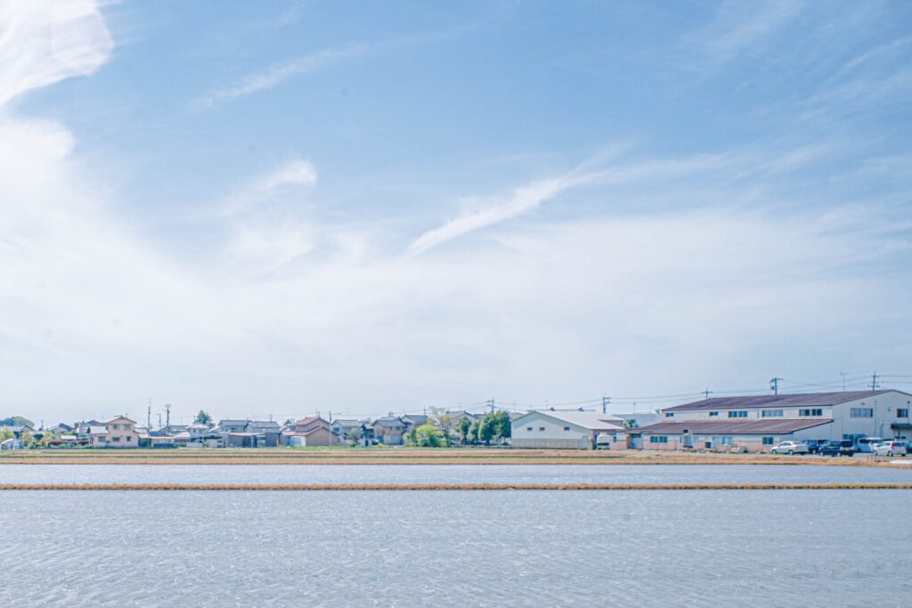 今まで雑草が生えていた農地に水が入り、田植えの準備が始まる。